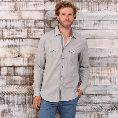 This double-pocket military-inspired shirt combines rugged style with modern sophistication. This shirt features flap patch pockets with box pleats, adding both functionality and a touch of classic military flair. The tonal contrast poplin along the placket and inside yoke provides a subtle yet stylish detail that sets this shirt apart.